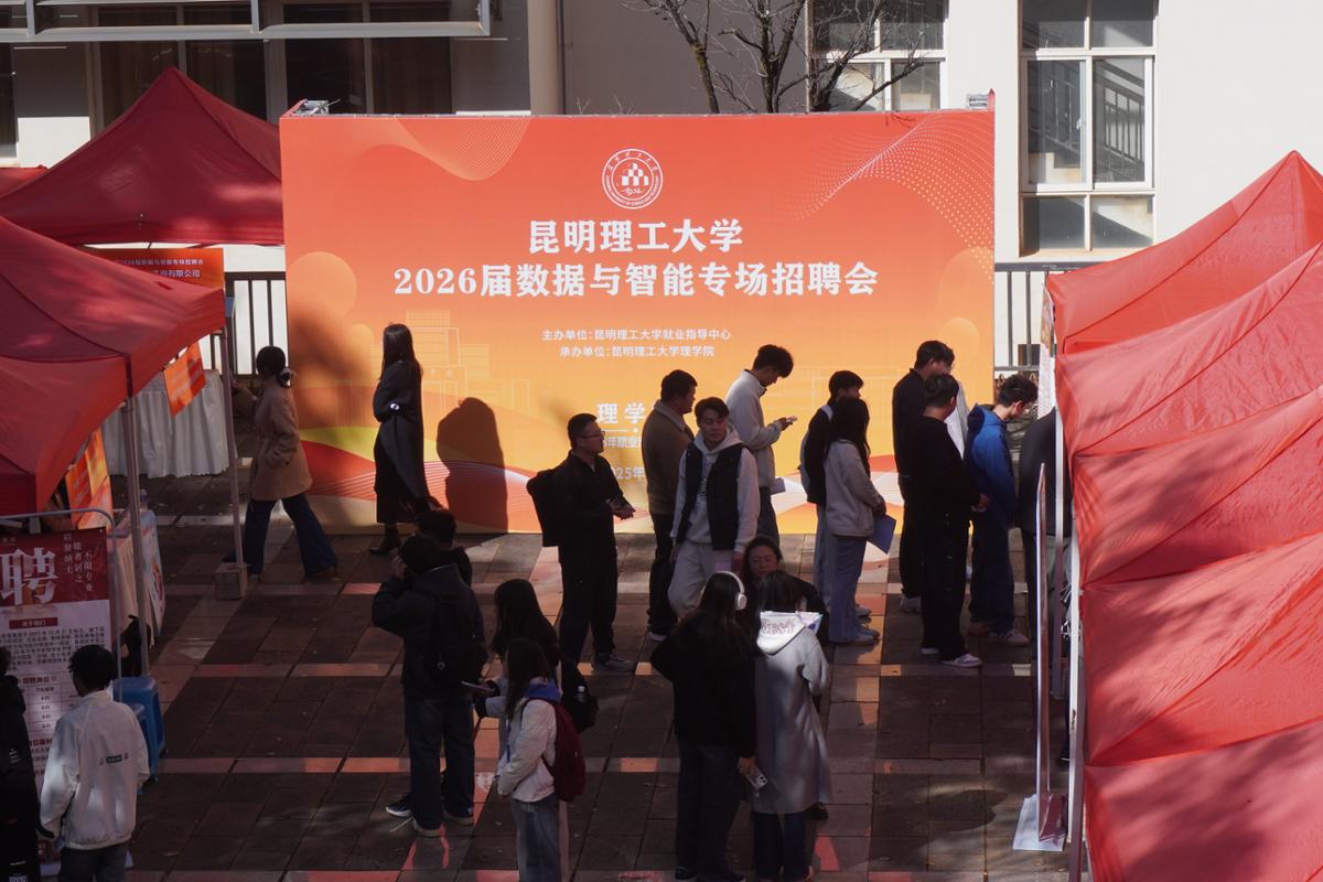 11月27日下午,由理学院承办的昆明理工大学2026届“数据与智能”专场招聘会在呈贡校区理学楼小广场举行。本次招聘会以“数理赋能扬帆广阔天地,胸怀祖国书写人生答卷”为主题,旨在搭建高效精准的校企双向选择平台,将数理学科优势转化为人才培养与产业发展的联动效能,助力毕业生实现高质量充分就业。