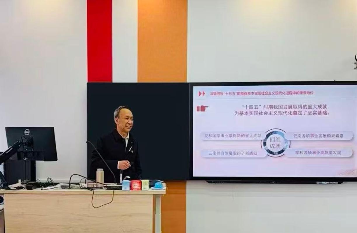 党课紧紧围绕党的二十大和二十届四中全会的重大意义、核心要义与实践要求展开。杨斌系统解读了全会审议通过的《中共中央关于制定国民经济和社会发展第十五个五年规划的建议》,深刻阐述了“十五五”时期在全面建设社会主义现代化国家进程中的关键地位。他结合国家发展大局、云南经济社会进步与学校教育事业发展实际,引导全体党员准确把握新发展阶段、贯彻新发展理念、服务新发展格局。