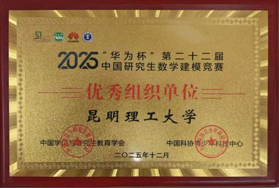 12月7日,2025年“华为杯”第二十二届中国研究生数学建模竞赛颁奖大会在中国矿业大学举行。本届赛事吸引了来自国内外631所研究生培养单位的26229支参赛队伍、78687名研究生报名参赛,共提交论文24371篇,参赛规模创历史新高。昆明理工大学荣获全国一等奖 1项、二等奖41项、三等奖 75项,117支参赛队伍获得成功参与奖。学校凭借出色的赛事组织工作、优异的竞赛成绩及高效的团队协作,荣获该赛事“优秀组织单位(得分排名全国第九位,云南省第一位)”和“先进个人”称号。