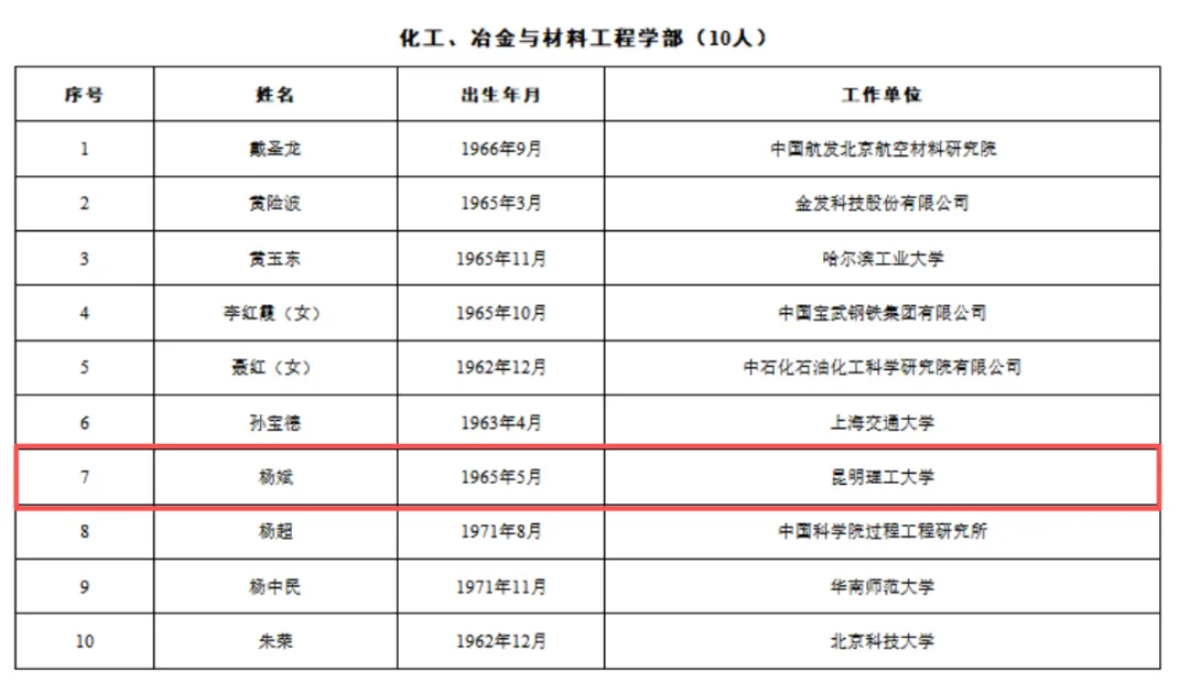 11月21日,2025年两院院士增选结果正式揭晓,共有144人当选。云南省昆明理工大学杨斌当选为中国工程院化工、冶金与材料工程学部院士。