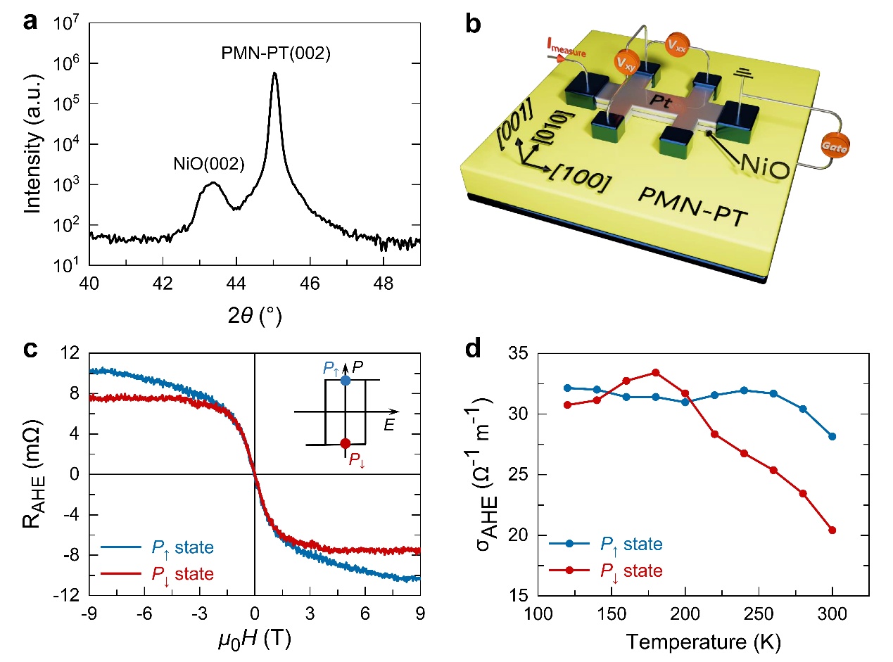 为应对大数据与人工智能时代对存储器件性能提出的严苛要求,并突破传统铁磁存储的技术瓶颈,反铁磁材料因其超快的自旋动力学、对外界微扰的稳定性及高集成潜力,被视为构建下一代高速、高密度存储技术的理想候选。然而,其净磁矩的缺失导致磁序难以被有效调控与探测,构成了其实用化的关键瓶颈。针对此核心挑战,本研究设计并构筑了Pt/NiO/PMN-PT多铁异质结,利用铁电衬底的电场可翻转极化,在室温下成功实现了对反铁磁绝缘体(NiO)磁序的全电学、非易失性及可逆调控。实验通过反常霍尔效应观测到高达33%的显著电学信号调制;结合同步辐射X射线磁性线性二色性谱的直接表征,进一步证实了反铁磁自旋轴的电场重取向。深入的解耦分析明确指出,铁电极化诱导的界面场效应是实现高效调控的主导物理机制。该工作攻克了反铁磁材料在电学操控方面的核心难题,为开发低功耗、高效率的反铁磁自旋电子学器件提供了可行的技术路径,对推动未来信息技术发展具有重要的科学意义与应用价值。