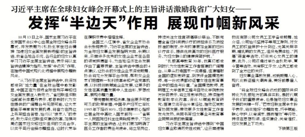 2024-06-1410月13日上午,国家主席习近平在北京国家会议中心出席全球妇女峰会开幕式,并发表题为《弘扬北京世妇会精神加速妇女全面发展新进程》的主旨讲话。我省各地各系统、各行业的妇女认真学习习近平主席主旨讲话,表示将以主旨讲话精神为指引,发挥“半边天”作用,在推进中国式现代化进程中展现巾帼新风采。“从习近平主席主旨讲话中,我深刻感受到‘她力量’在全球治理中愈发彰显,中国正在为促进全球性别平等和妇女全面发展注入新...