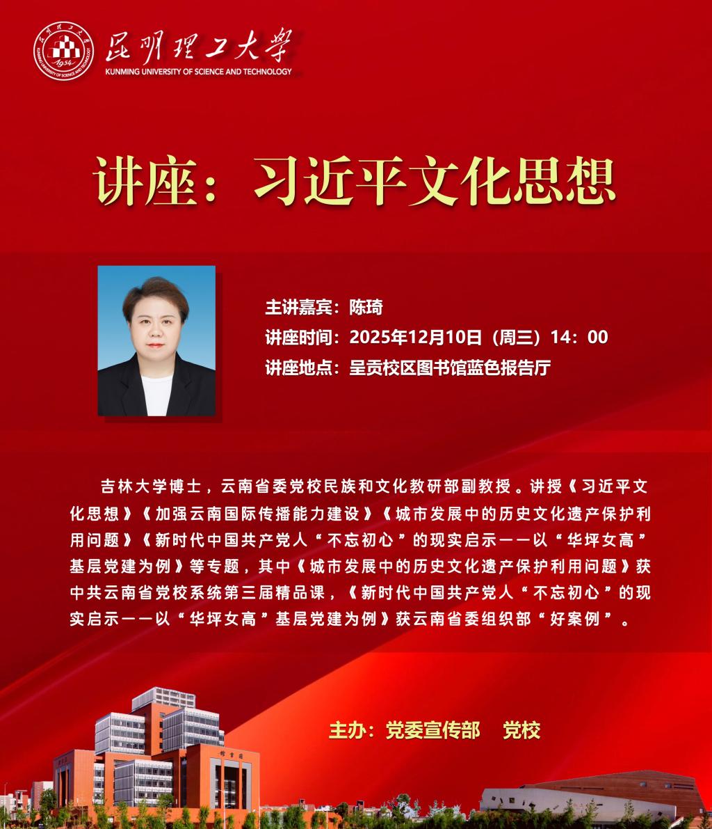 12月4日下午,昆明理工大学举行2025年党员基本培训第三次集中大课,全校1.04万余名师生党员共同学习中央党校(国家行政学院)分管日常工作的副校长(副院长)、教授谢春涛主讲的专题课程《中国共产党与中华民族伟大复兴》。本次培训在呈贡校区红土会堂设主会场,在莲华、新迎、呈贡三校区和津桥学院设立91个分会场同步进行。校党委书记唐家华主持大课。谢春涛从夺取新民主主义革命伟大胜利、完成社会主义革命和推进社会主义建设、进行改革开放和社会主义现代化建设、开创中国特色社会主义新时代四个历史阶...