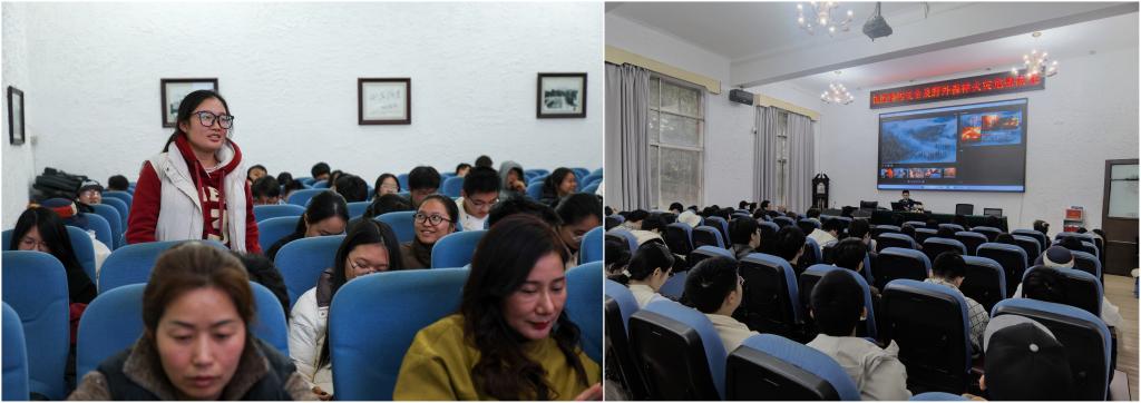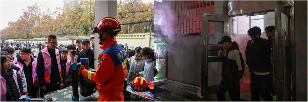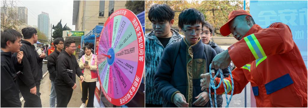 本次活动分为消防安全沉浸式体验活动、消防安全知识讲座和消防疏散演练三个环节。消防安全沉浸式体验活动邀请了昆明市森林消防支队进行现场指导,设置了“消防服穿戴挑战”“绳结求生赛”“知识幸运盘”和“标识拼拼乐”等6个互动体验活动,同学们在寓教于乐的氛围中,学习掌握了消防安全知识与技能。消防安全知识讲座由昆明市森林消防支队直属大队二中队副中队长李昀澳担任主讲,李昀澳结合自身救援经历,以图文并茂、视频教学等方式,为现场师生深入浅出地讲解了相关消防知识。