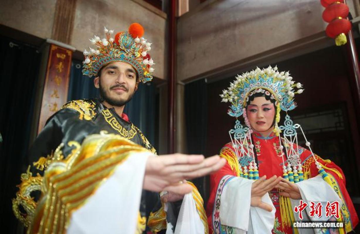 11月15日,青年代表着凤冠霞帔,体验滇剧魅力。黄兴鸿 摄