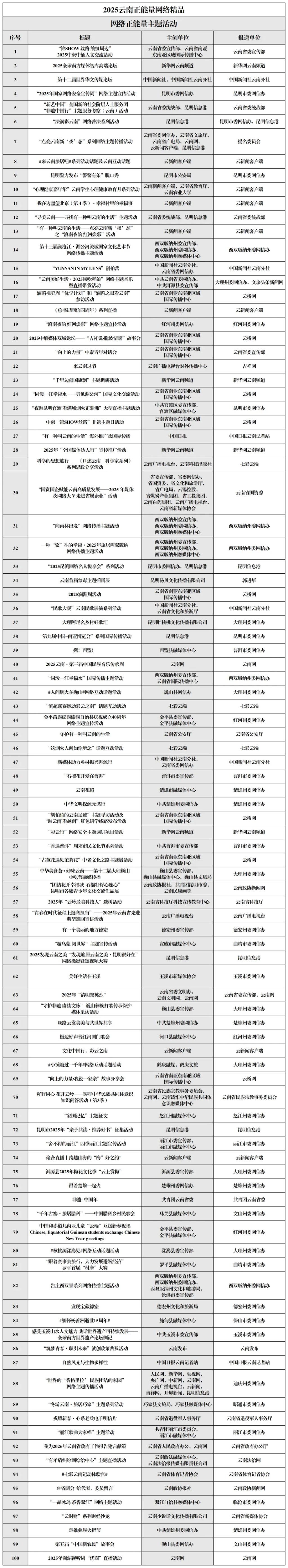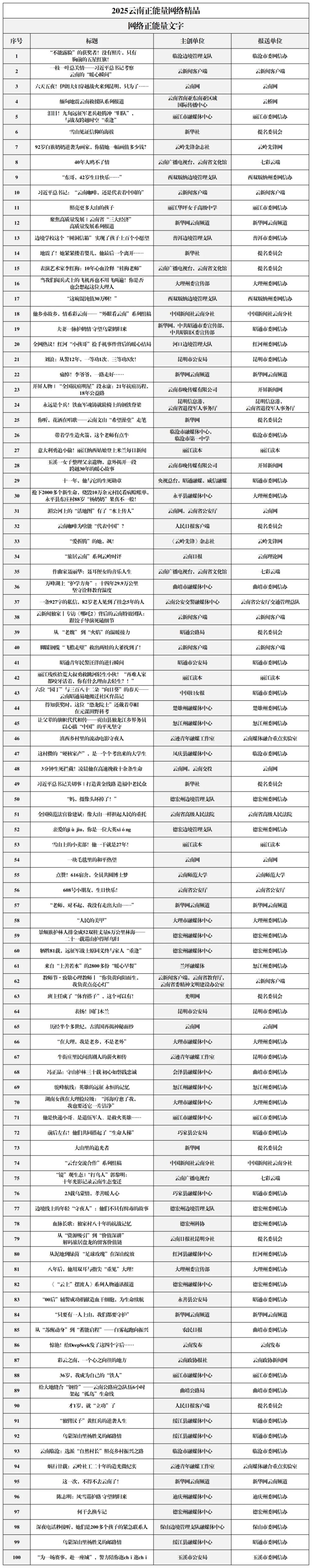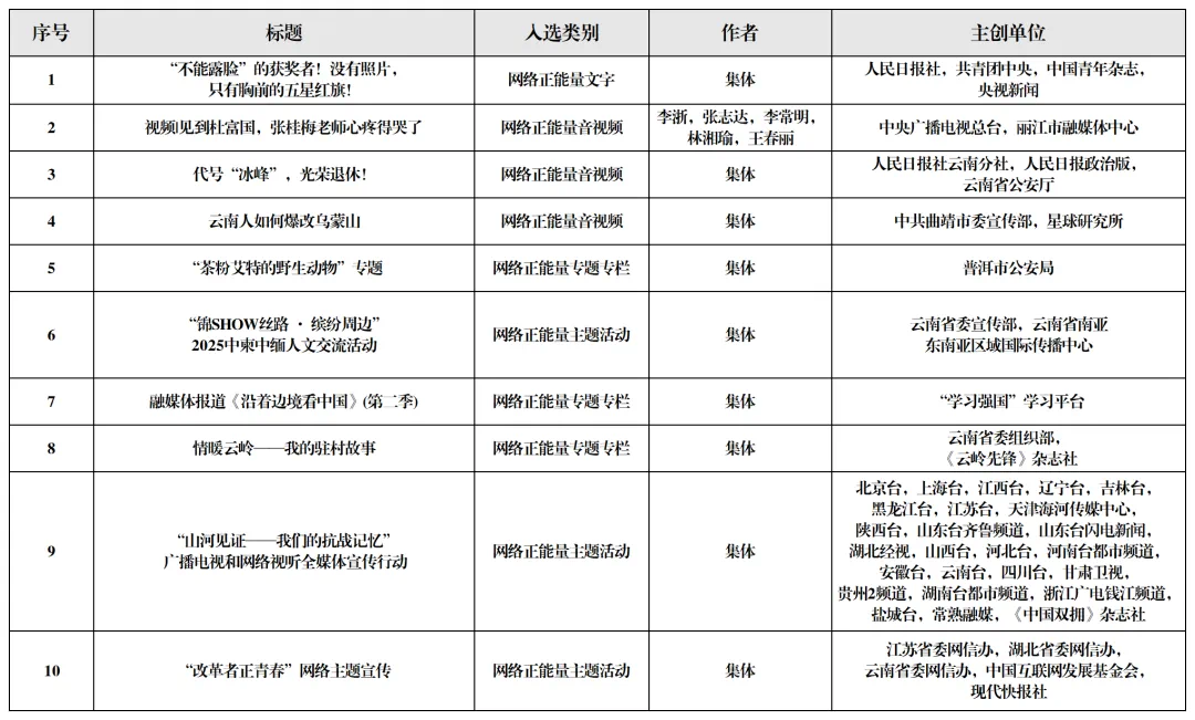 2025中国正能量网络精品和中国正能量网络传播AI精品案例入选名单在3月28日至29日举行的2026中国网络媒体论坛上正式发布。云南省共有10件作品入选中国正能量网络精品,3件作品入选中国正能量网络传播AI精品案例。 为做大做强网上正面宣传的声量、流量,云南省同步开展了2025云南正能量网络精品征集展播活动,发掘和推出了515件有温度、有力量、有影响力的云南网络正能量精品。现将名单一并公布。