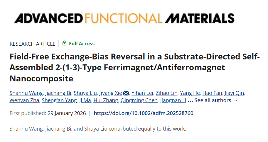 近日,昆明理工大学材料科学与工程学院伍亮博士团队在自组装磁性功能薄膜方面取得重要进展,相关研究以“Field-Free Exchange-Bias Reversal in a Substrate-Directed Self-Assembled 2-(1-3)-Type Ferrimagnet/Antiferromagnet Nanocomposite”为题在线发表在材料学领域顶级期刊《Advanced Functional Materials》上。