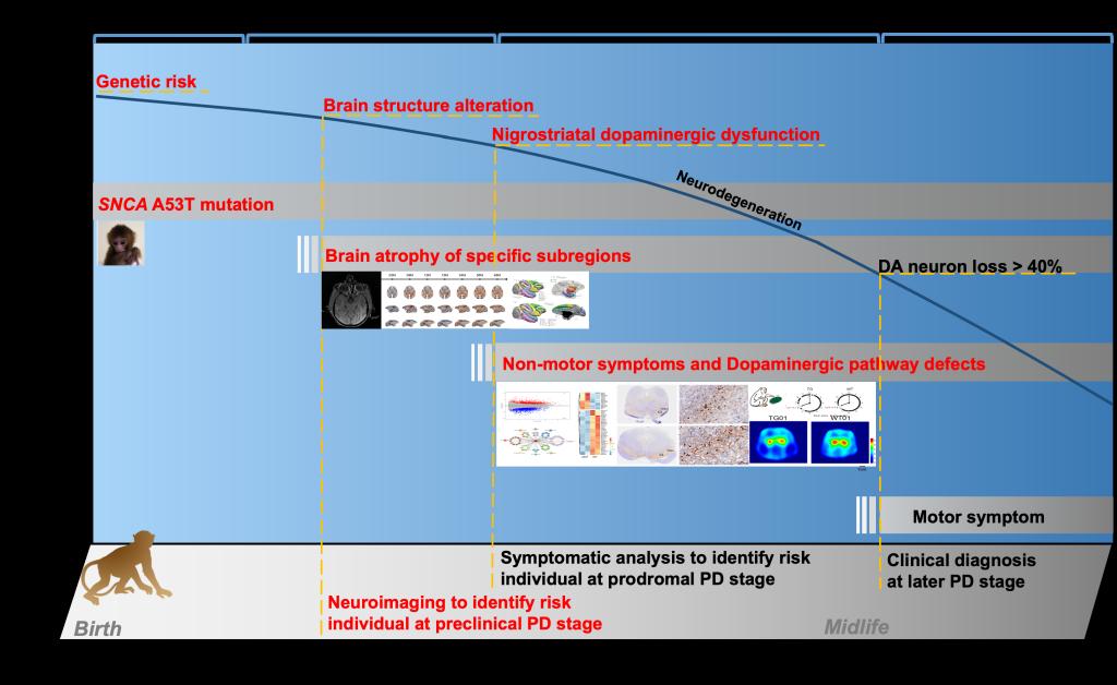 近日,昆明理工大学季维智/牛昱宇团队联合美国北卡罗来纳大学研究团队在Brain发表了题为“α-Synuclein aggregation and brain atrophy in SNCA-A53T transgenic monkeys correlate with parkinsonism”的研究。帕金森病(Parkinson’ Disease, PD)是一种常见的神经退行性疾病。随着中国人口老龄化的加剧,近三十年间,我国与帕金森病相关的疾病负担指标均呈快速上升趋势,严重影响老年人群的健康。PD通常以隐匿的睡眠障碍和躯体症状开始,当静止性震颤、运动迟缓等典型运动症状出现时,中脑黑质的多巴胺能神经元已发生大量丢失,此时治疗效果有限。因此,阐明PD前驱期的病理生理变化,是实现早期诊断与疾病干预的关键。然而,现有临床前模型,尤其是广泛使用的小鼠模型,在模拟人类PD复杂的、渐进的多系统病理及非运动症状(如与人类高度相似的快速眼动睡眠行为障碍)方面存在局限,极大地制约了对疾病起源和早期干预靶点的探索。