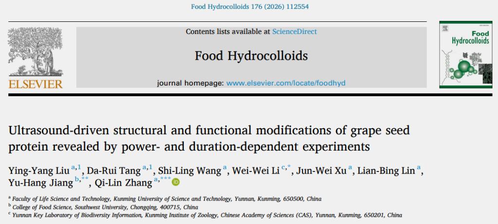 近日,昆明理工大学饲用抗生素替代技术工程中心林连兵课题组与中国科学院昆明动物研究所李维薇、西南大学食品科学学院江宇航开展合作,在葡萄籽蛋白超声改性功能跃升方面取得研究进展,相关成果以“Ultrasound-driven structural and functional modifications of grape seed protein revealed by power- and duration-dependent experiments”为题,发表于国际学术期刊《Food Hydrocolloids》。