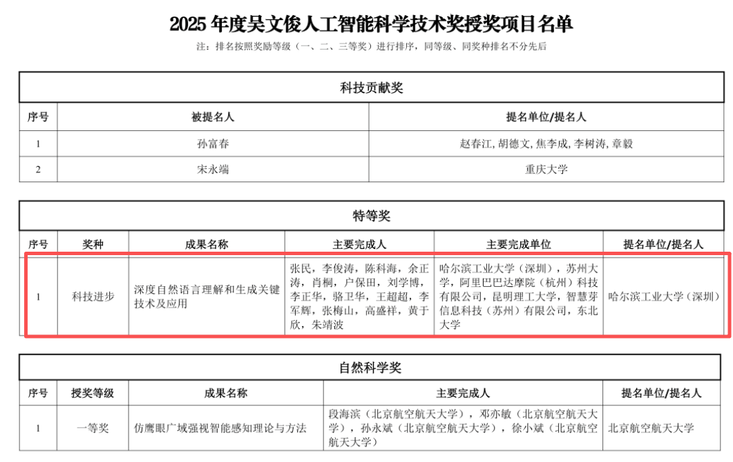 此次荣获特等奖的“深度自然语言理解和生成关键技术及应用”项目,由哈尔滨工业大学(深圳)、苏州大学、阿里巴巴达摩院(杭州)科技有限公司、昆明理工大学、智慧芽信息科技(苏州)有限公司、东北大学等单位共同完成。该项目在深度自然语言理解和生成领域取得了系统性原创突破,相关技术已实现大规模产业化应用,为我国人工智能核心技术自主创新作出了重要贡献。